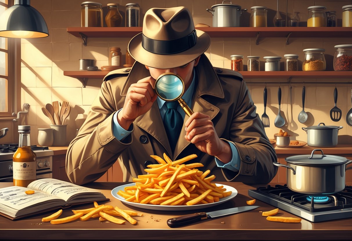 A cozy kitchen table with a half-eaten chocolate chip cookie, spilled milk, a magnifying glass on an open recipe book, a basket of French fries, and a shadowy figure outside the window.